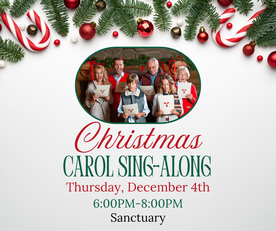 Christmas Carol Sing-Along in the Sanctuary. All are welcome. Contact Jake Burkholder with any questions.